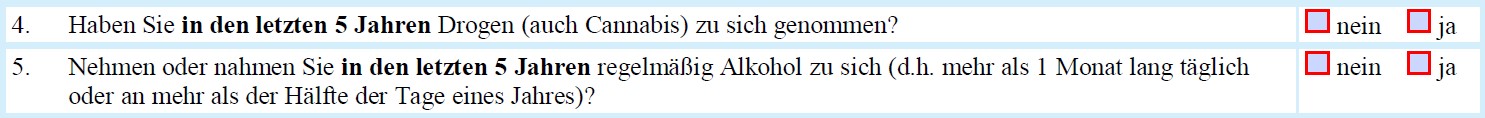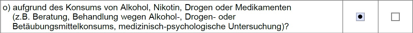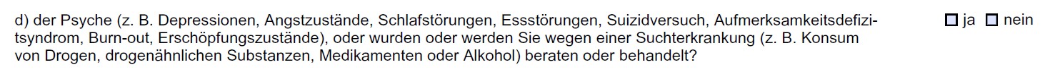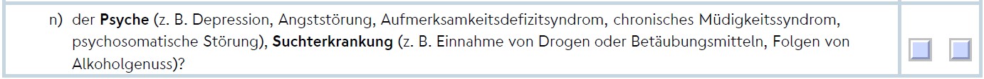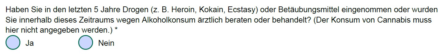 **Hinweis: Die Nürnberger Versicherung formuliert ihre Drogenfrage meiner Meinung nach nicht kundenfreundlich. Setzt man den Anfang und das Ende der Frage zusammen, lautet sie: “Bestehen oder bestanden in den letzten 5 Jahren Krankheiten, Beschwerden oder Funktionsstörungen der Psyche (z.B.[...]), Suchterkrankung (z.B. Einnahme von Drogen oder Betäubungsmitteln, Folgen von Alkoholgenuss)?”: