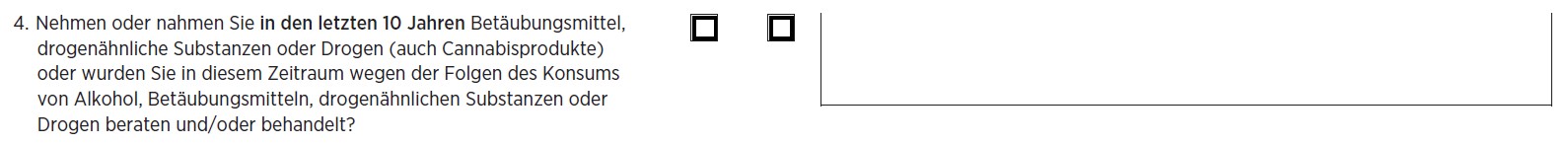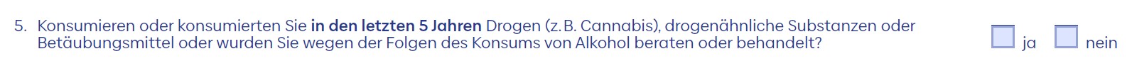 Man möchte also wissen, ob du in den letzten 5 Jahren Drogen konsumiert hast oder wegen Alkoholkonsums ärztlich beraten oder behandelt wurdest. Gleichzeitig wird mit dem letzten Satz in Klammern klargestellt, dass Cannabis-Konsum explizit nicht angabepflichtig ist. Man darf also den Eindruck gewinnen, dass der Münchener Versicherer dem Kiffen ab Mitte 30 kein so großes Risiko mehr beimisst, wie man das im jüngeren Alter tut. Denn: